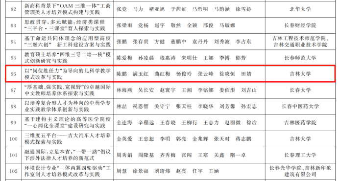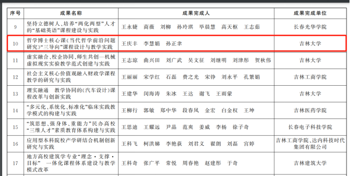 其中,公司孙正聿等教师主持的《“用理论铸魂育人”的思政教育实践与创新》课题荣获特等奖;王庆丰等教师主持的《哲学博士核心课<当代哲学前沿问题研究>“三导向”课程设计与教学实践》,曲红梅等教师主持的《哲学课程综合改革与实践的“学科育人”机制研究》课题,曲红梅与吉大二院的陈鹏等教师主持的《以“岗位胜任力”为导向的儿科学教学模式改革与实践》课题均荣获三等奖。