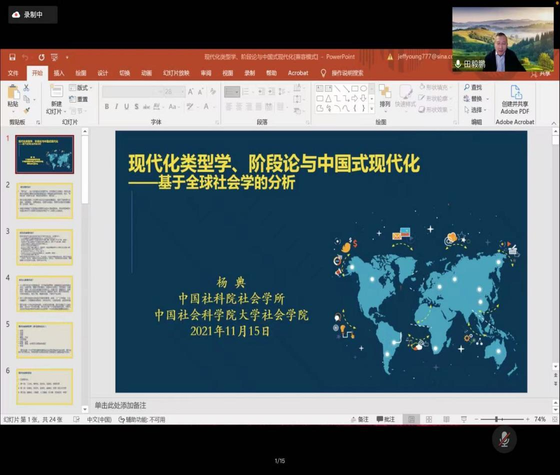 2021年11月15日,“BETWAY必威名家系列”讲座第149场——《现代化类型学、阶段论与中国式现代化:基于全球社会学的分析》,以线上会议的方式成功举行。主讲人为杨典研究员,哈佛大学社会学博士、中国社会科公司社会学所副所长、中国社会科公司大学社会公司副经理。本次讲座由田毅鹏经理主持,公司100余名同学线上参加了此次会议。