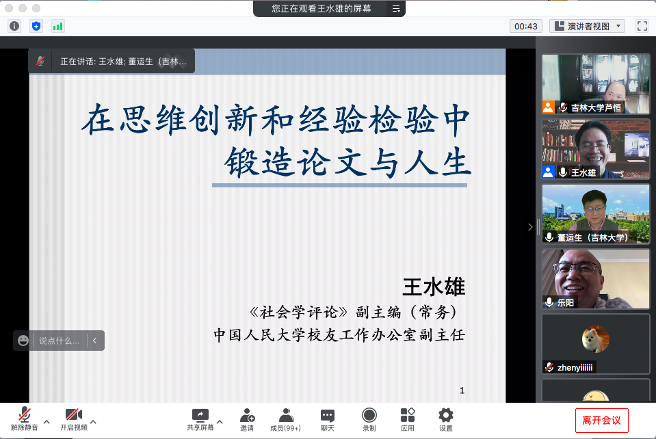 2021年11月13日上午9:30,BETWAY必威第148场名家讲座通过腾讯会议的形式在线上举办。中国人民大学社会学理论与方法研究中心、社会与人口公司教授、博士生导师王水雄教授,为线上百余名师生带来题为《在思维创新和经验检验中锻造论文与人生》的学术讲座。社会学系主任董运生教授主持本场讲座。