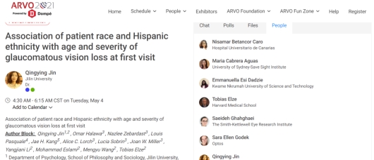 本届年会的主题是:变革性的眼与视觉研究。在过去的十年里,创新和先进的技术促进了眼睛和视觉研究领域的重大发现,与其他任何学科的发现不相上下,2021年大会的主题是关注人类视觉的下一场革命。公司金庆英副教授受邀参加了本次大会,并做了题为《Association of patient race and Hispanic ethnicity with age and severity of glaucomatous vision loss at first visit》的报告。研究有助于发现病理视觉在不同人群中的特征差异,进而为正常视觉的解剖生理机制研究指引方向,同时也为临床干预提供依据。该报告引发了与会者的热烈探讨,这些宝贵的建议和交流对视觉的相关研究具有重要的启发意义。