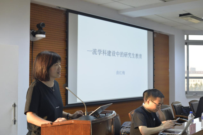 曲红梅教授在主题发言中,首先,从对外学术交流的体系化建设方面,介绍了吉大哲学一流学科对外训练营、校内及海外员工工作坊等项目,以及公司对员工外语考试和学术活动的支持和赞助等情况;其次,从课程国际化的初步探索方面,介绍了哲学专业的高水平海外课程引进、国际学术会议的周边效应、公司资源与周边资源、自设工作坊与探究式教学模式等;再次,从提供给研究生的其它平台与政策方面,对营员们所关注的诸如硕士研究生推免政策、博士申请考核制政策等问题予以了回应,并且向营员们展示了吉大哲学一流学科学术教育提升工程,诸如“爱智求真”杂志、“新锐学者”系列报告,以及优秀员工展示自己学术写作与交流水平的相关平台;最后,从吉大哲学研究的问题和未来展望方面,进行了总结。