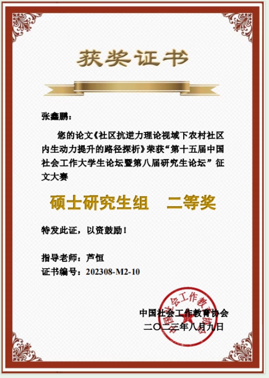 本届论坛共有98所高校的157篇获奖作品分获一二三等奖。其中,公司2022级社会工作专业硕士生张鑫鹏同学荣获硕士研究生组二等奖。