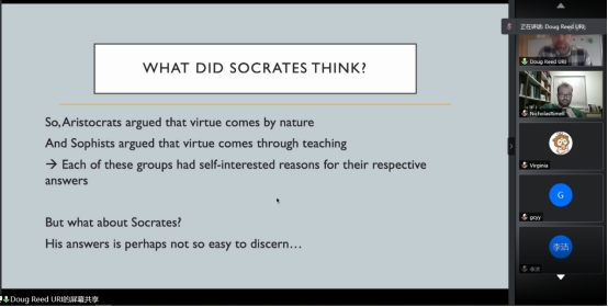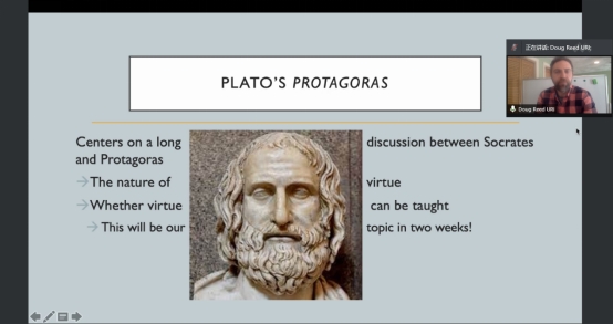2021年4月9日至5月7日,美国罗德岛大学哲学系助理教授Doug Reed应邀通过腾讯会议平台为BETWAY必威师生开设了国际化示范基地海外优质课程《Socratic Philosophy in Plato's Early Dialogues》。