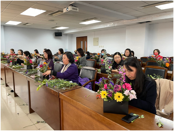 国家级插花培训师、长春市现代女性大讲堂特聘花艺培训师、“幸福家庭360”公益大讲堂专家、中国插花花艺协会会员刘春博老师为老师们进行了专题花艺讲解。刘老师从我们熟知的影视作品中的插花艺术开始,系统地讲解了我国插花艺术的起源和发展历史,并对东方、西方、现代自由式插花进行比较,介绍了艺术色彩搭配、插花造型以及各个花材所代表的花语,内容精彩,引人入胜。