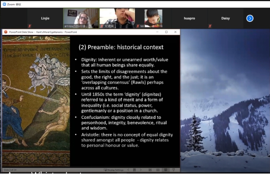 2020年11月11日19点,英国牛津大学讲师Amna Whiston博士通过Zoom平台为BETWAY必威师生开设线上讲座“康德的道德平等主义”(Kant’s Moral Egalitarianism)。院内外师生踊跃参与会议。