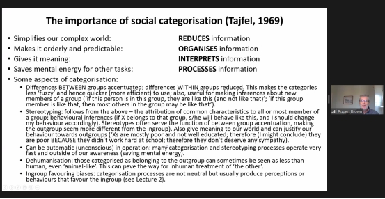 布朗教授在第一、二堂课上分别介绍了偏见的定义以及主要理论,如何从人格视角和认知视角去理解偏见,并对相对剥夺、现实冲突、社会认同、群际情绪四个重要方面进行了详细的介绍,让我们了解了社会心理学视角下的偏见形态;在第三堂课上,教授介绍了研究的现实意义,以及可通过群际接触等方法来减少生活中的偏见;在最后一堂课上,教授带同学们领略了著名波兰心理学家亨利·泰菲尔传奇的一生。