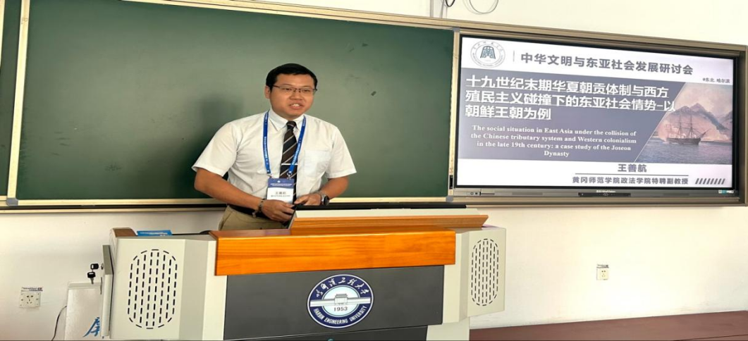 黄冈师范公司政法公司王善航副教授作了题为《十九世纪末期华夏朝贡体制与西方殖民主义碰撞下的东亚社会情势——以朝鲜王朝为例》的报告。他认为,19世纪,高宗时期的朝鲜王朝开始在清廷与日本的压力夹缝谋求国家自主发展之路,继而不断在既有礼制历法的朝贡体系及巧取豪夺与合约精神的殖民主义之间游移,进而采行对冲理论的外交策略。从社会角度来看,列强的进驻,不仅打开了朝贡体系封闭的循环,也激起东亚诸国开港开市,进行了各自的自强运动,东西文化的对撞交融也由此不断深化。