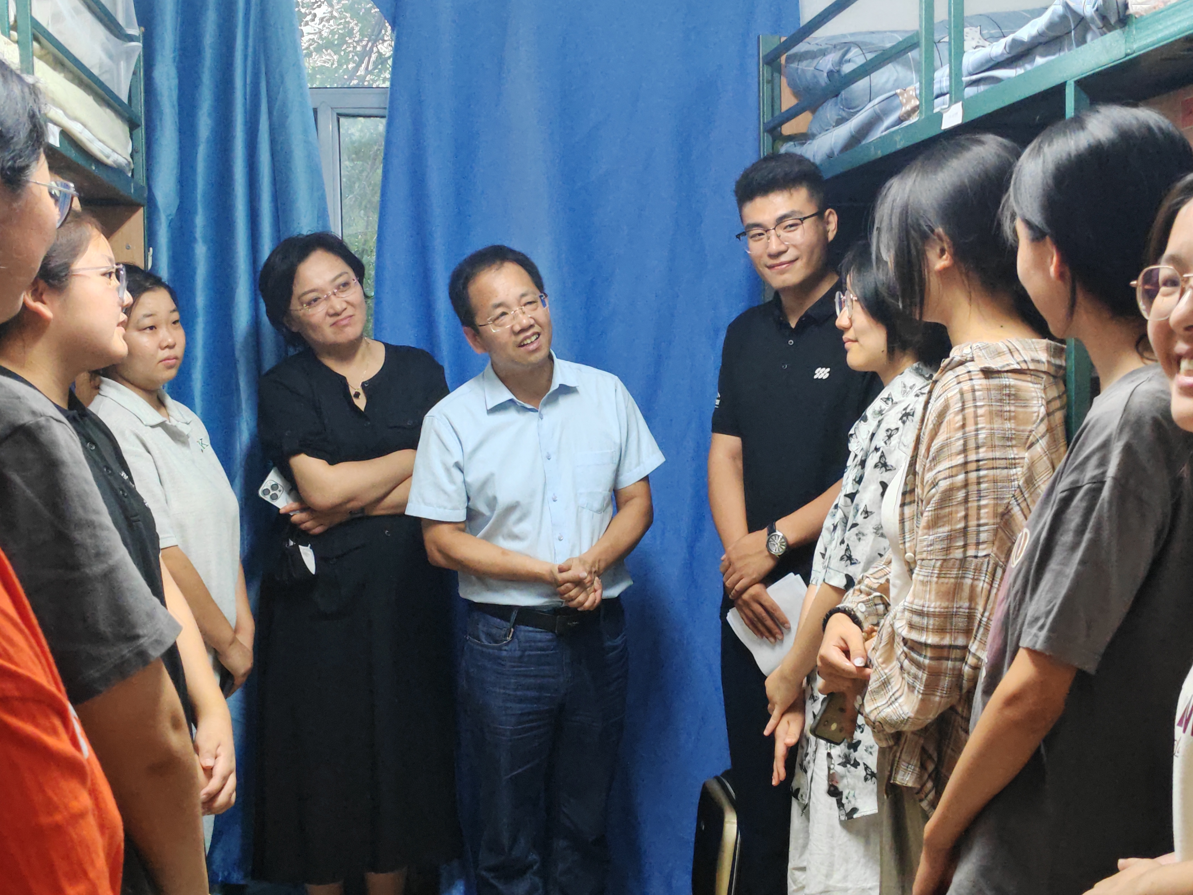 在走访交流过程中,刘培强老师带领员工工作办公室的各位老师们共同对新生寝室的各项消防安全设施以及基本设备的布置情况进行了检查,并与同学们亲切交流。
