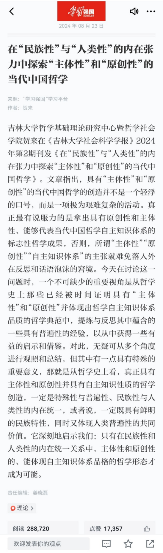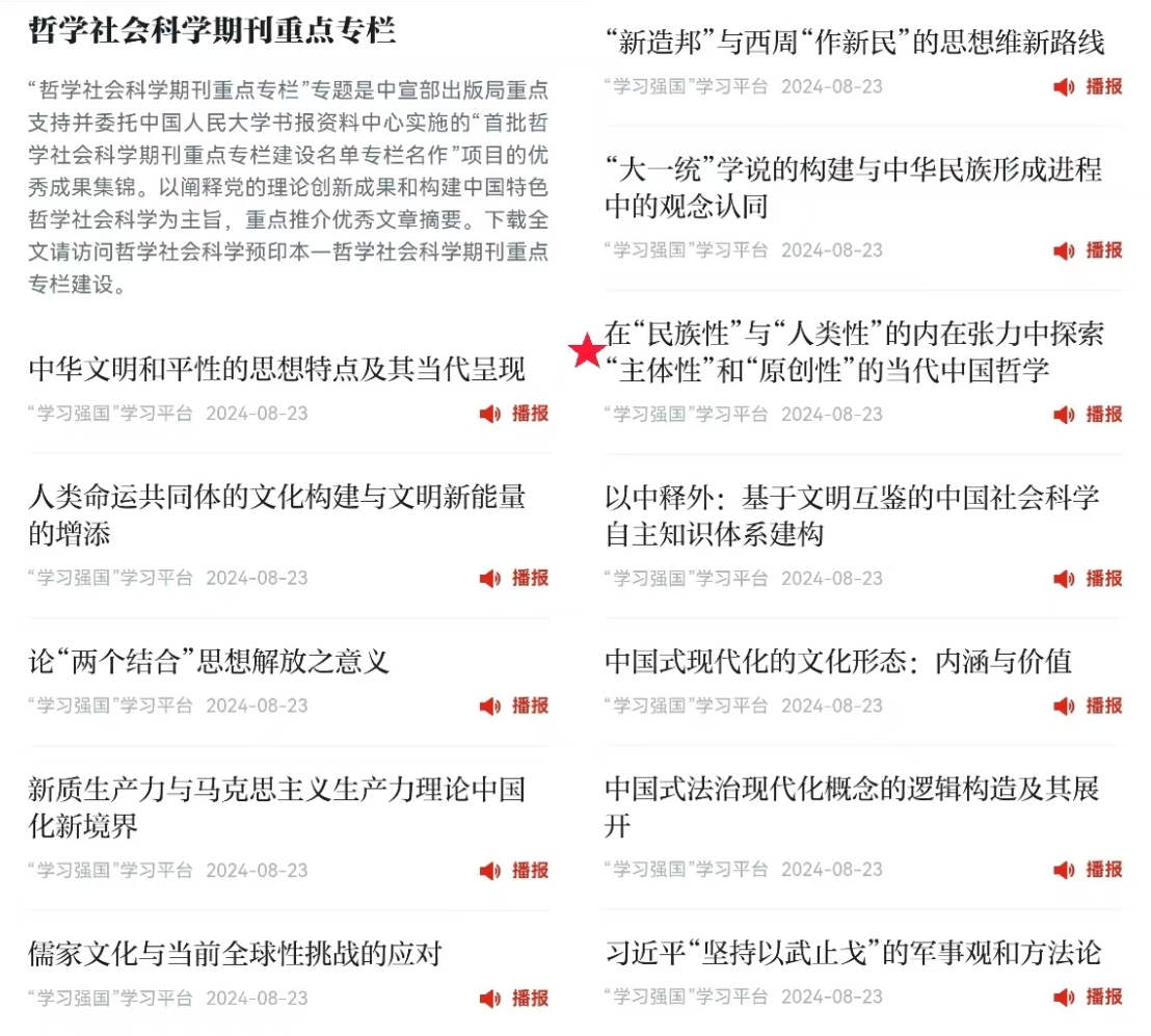 据悉,2024年8月23日,“学习强国”手机客户端开设了“专栏建设”优秀成果推宣专版,首批推出了20篇优秀成果的文章摘要。截至本文发稿前,贺来教授的该篇成果在“学习强国”学习平台的阅读量达28万余次。
