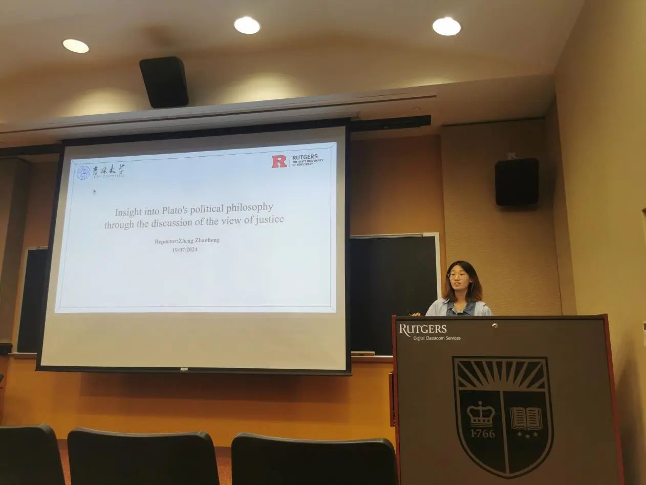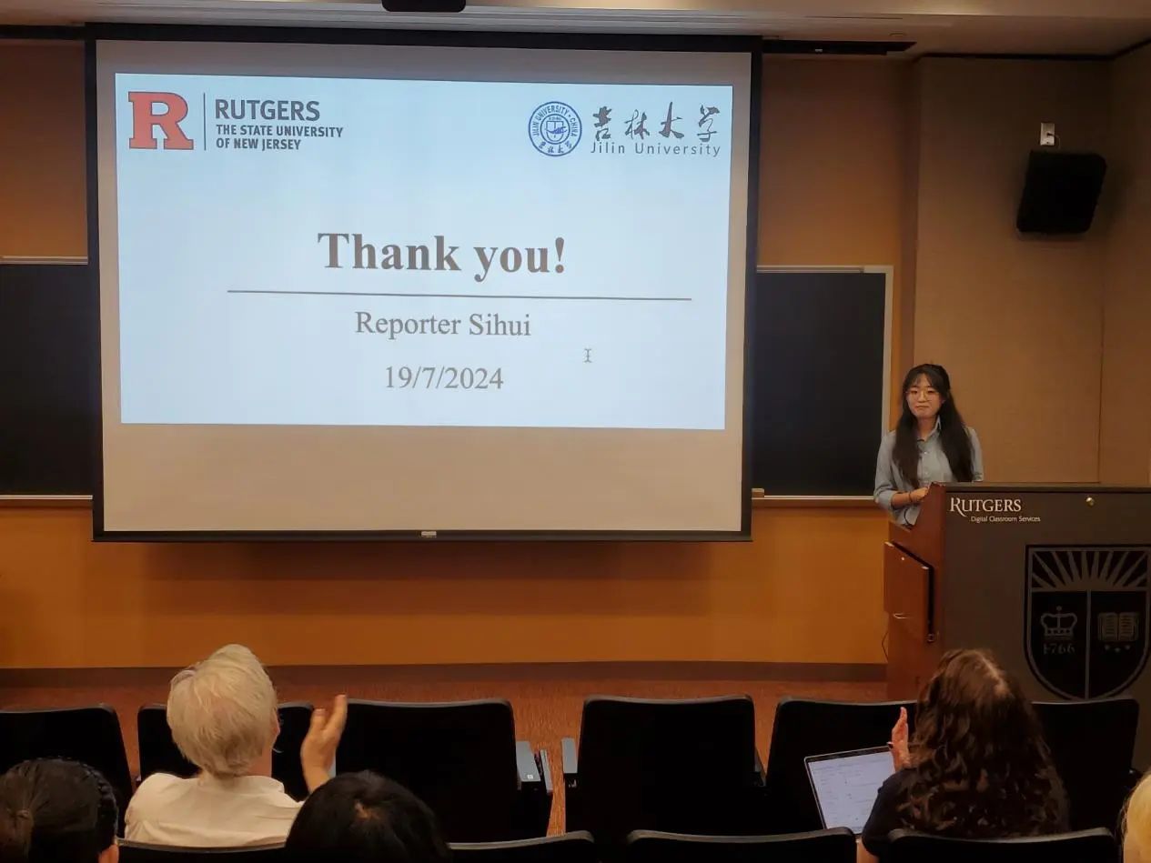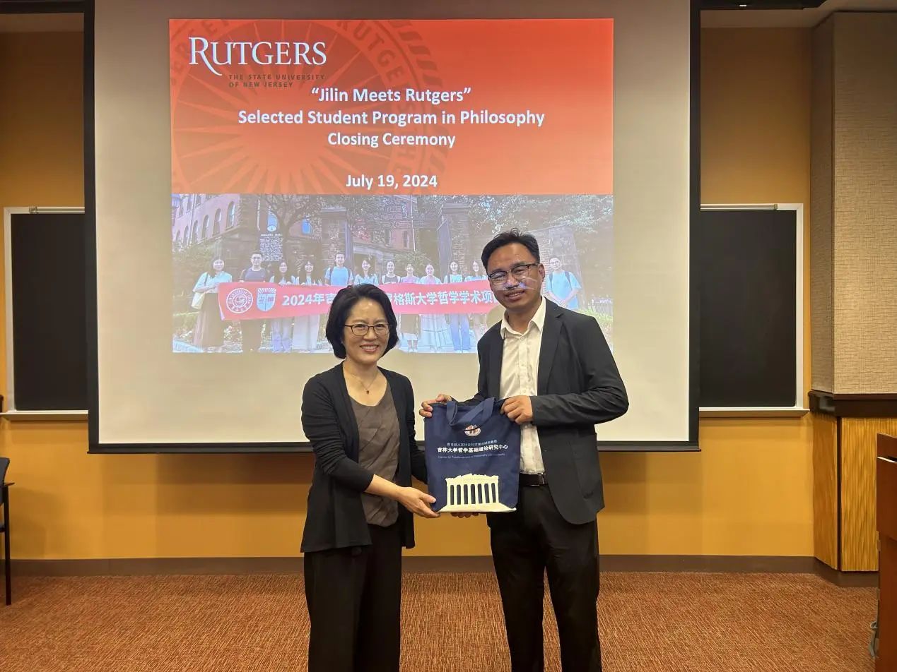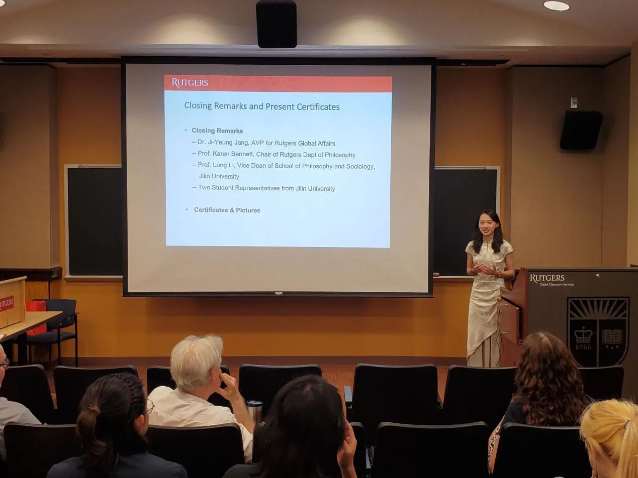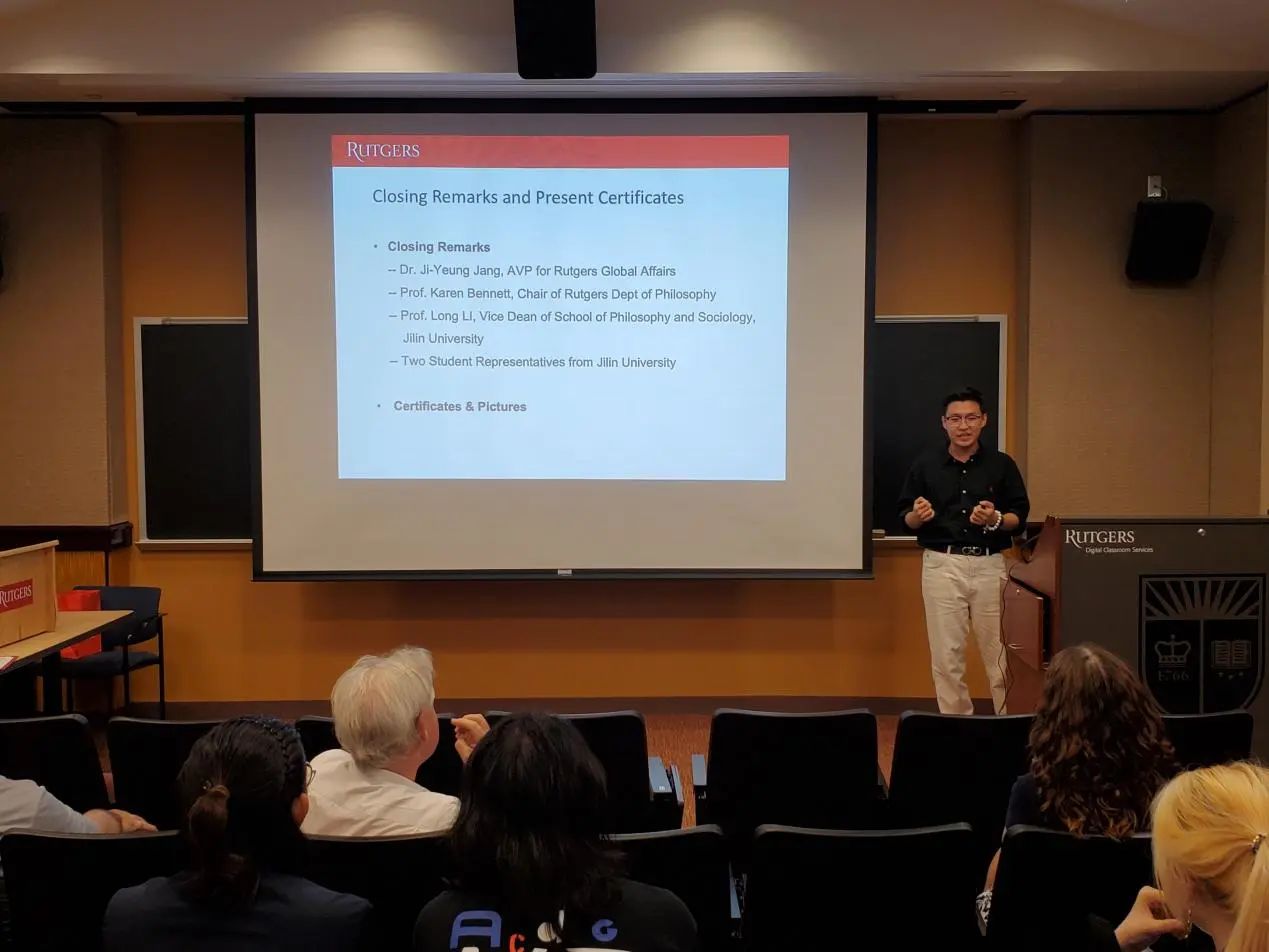 罗格斯大学哲学系系主任Karen Bennett教授和哲学系的Michael Glanzberg教授、Trip McCrossin教授对同学们的结业展示进行了点评与提问,并提出建议。三位教授都对同学们的表现给予了肯定与赞许,表示同学们的表现超乎了预期。接着,两校师生在轻松愉快的氛围下共同观看了由罗格斯大学国际处制作的“Jilin Meets Rutgers”哲学暑期公司的总结视频。