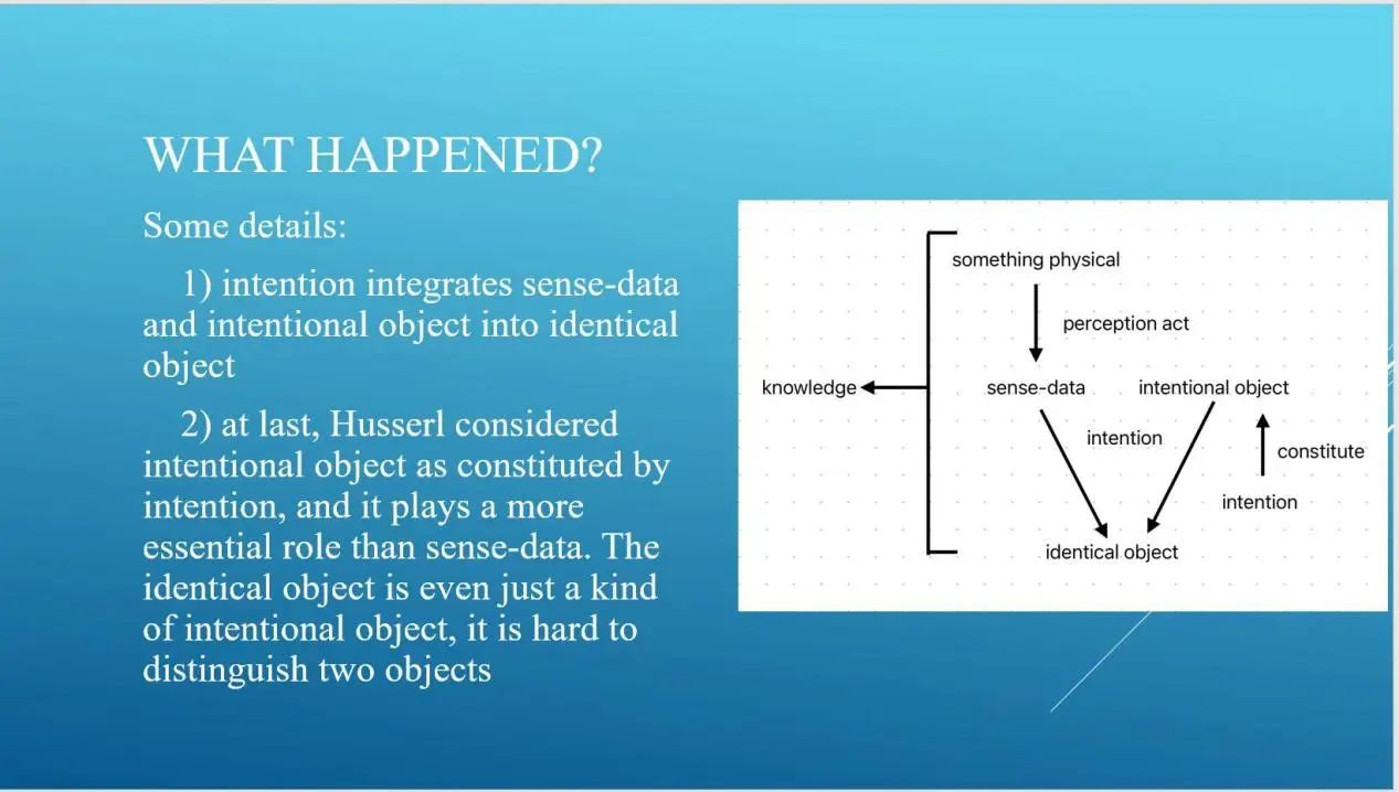 本次展示以意向性为主题,旨在讨论胡塞尔意向性与约翰·塞尔意向性两种不同的意向性理论,说明两种理论关注的问题与不同的研究方式。胡塞尔意向性主要涉及到意向对象的自身构造、意向对象与质料的统一、意向性与康德先天直观形式的区别等内容;约翰·塞尔的意向性主要涉及到对意向状态的区分、意识的符合方向、涉因性自指及满足条件、意向性网络等。最后,计划讨论现代心灵哲学中与意向性相似的对意识问题的其他解决方案,如福多的Modularity。