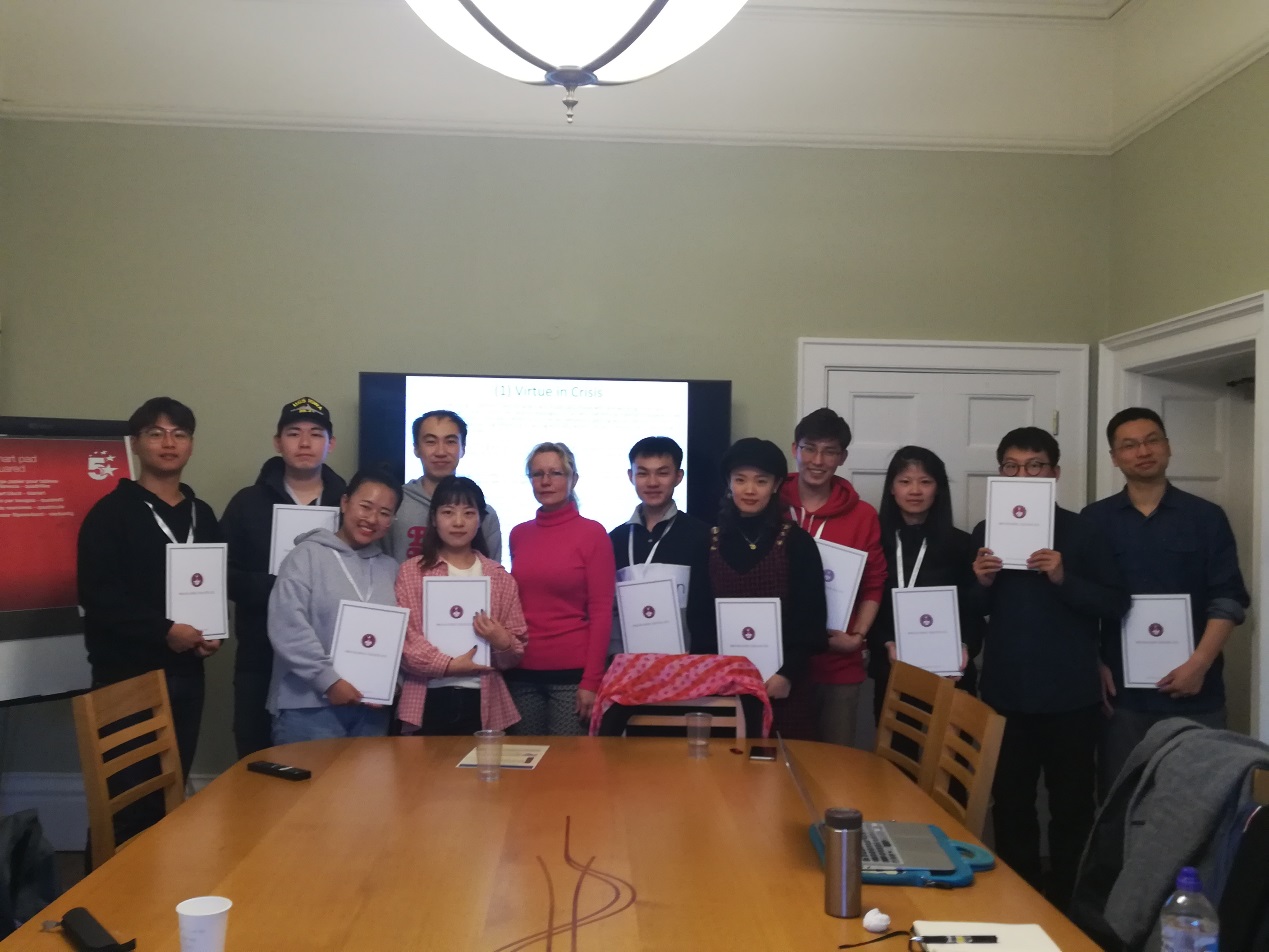 11月15日,交流团在牛津大学参加课程。Mackenzie Graham博士以“Arete, Phronesis, and Eudaimonia: A Survey of Arisotelian Virtue Ethics”为题,讲述了有关亚里士多德的美德伦理学。因为话题与同学们在国内的研究方向息息相关,课堂氛围十分活跃。而后,Roxana Baiasu博士以“Feminist Discussions of Moral Justification and Autonomy”为题,与同学们探讨了有关女性主义的话题。女性主义在当今社会已经越来越受到重视,在课堂上同学们也就该问题展开了热烈的讨论。最后,Anna Whiston博士以“To What Extent Is the Concept of Virtue Still Important in Today’s World?”为题,与同学们讨论了美德伦理学在当代的重要作用,并提出了一种道德强化剂的设想。指出道德强化剂能够增强人的共情能力,使人有更加强烈的欲望去做有美德的事。同学们对此也表现出了浓厚的兴趣,与Anna Whiston博士进行了积极探讨。课程结束之后,Anna Whiston博士为同学们颁发了学习证书。至此,BETWAY必威“2019年BETWAY西汉姆联员工国际竞争力卓越计划——‘牛津大学-BETWAY西汉姆联哲学短期课程项目’”顺利结束。