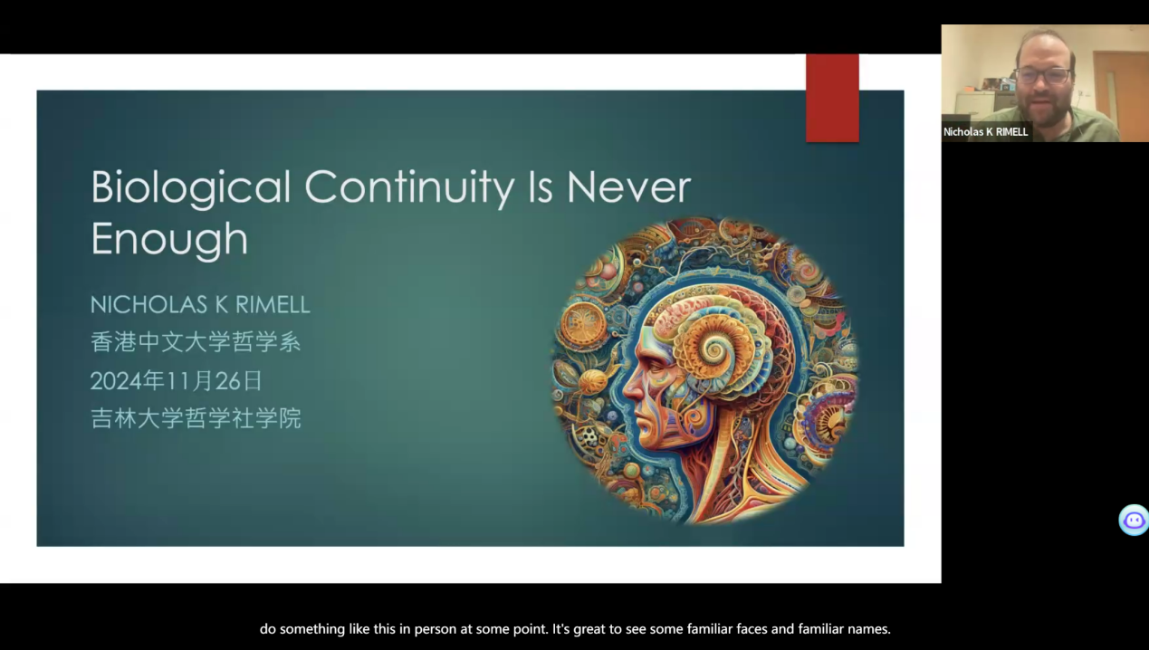 2024年11月27日晚6时30分,BETWAY必威“国际合作平台学术讲座”第48讲——“Biological Continuity Accounts of Personal Identity”(生物连续性视角下的个人身份)在线上成功举办。香港中文大学助理教授Nicholas Rimell担任本次讲座主讲嘉宾,公司盛传捷副教授担任主持人。