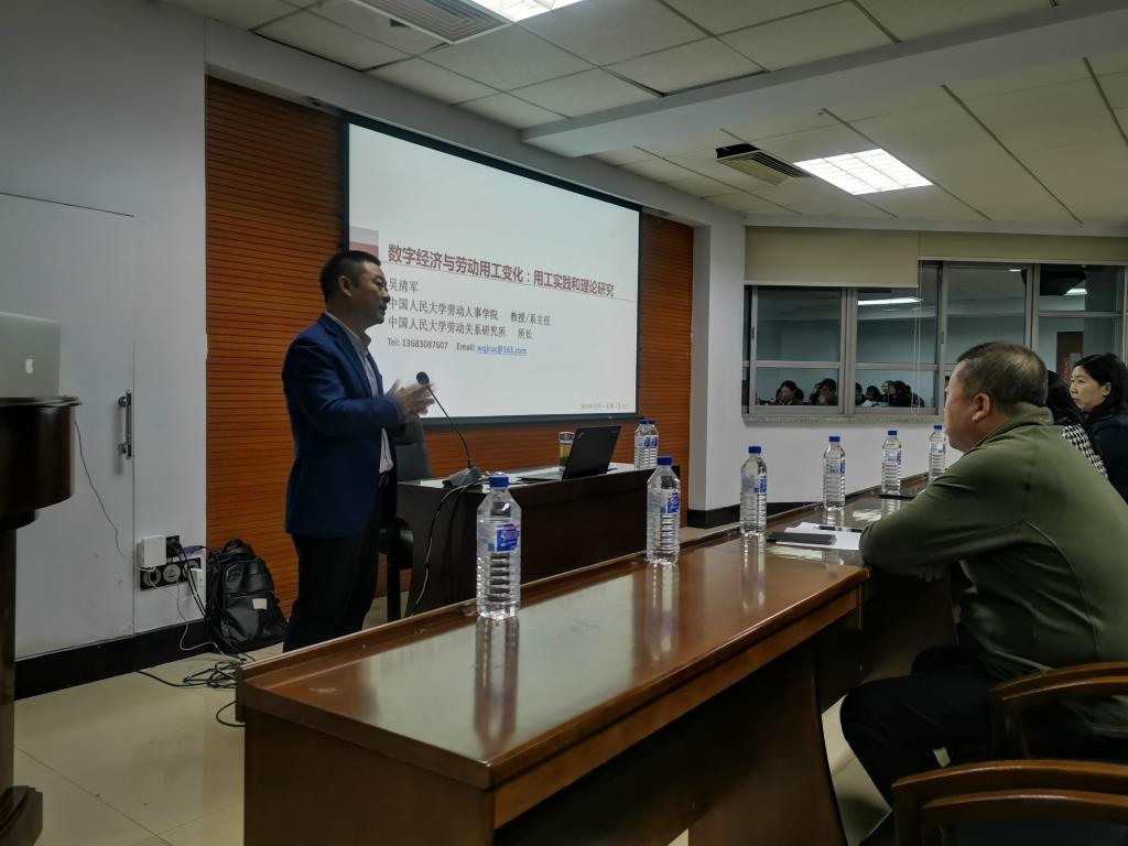 2019年10月10日晚6点,BETWAY必威第60场学术名家讲座在东荣大厦904会议室举行。中国人民大学劳动关系研究所所长、中国劳动经济学会劳动关系分会副会长、中国人力资源开发研究会劳动关系分会学术委员会主任、中国人民大学劳动关系系主任吴清军教授,作了题为“数字经济与劳动用工变化:用工实践和理论研究”的学术报告。