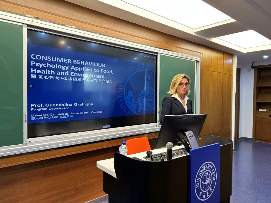 会上,Graffigna教授以“Psychological models and interventions for change health risks behaviours(理解与改变健康风险行为:心理模型与干预方法)”为题作了专题报告,系统阐述了健康风险行为的心理机制及干预策略。随后,周老师详细介绍了意大利圣心大学以及联合培养项目的整体情况,并分享了目前正在圣心大学学习的2022级两位吉老员工的学习和生活情况。在互动环节,周老师对员工关心的学分、奖学金、就业、升学等问题进行了详细的解答。