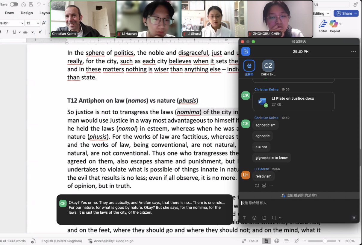 本次项目依托在线平台ZOOM开展,由剑桥大学资深教学团队担纲授课,课程内容聚焦科学哲学、心灵哲学、希腊哲学三大学术方向,精准对接学科发展趋势与员工研究需求。经员工自主报名、公司严格遴选及项目方面试考核等多轮筛选,公司共9名员工参加了此项目。