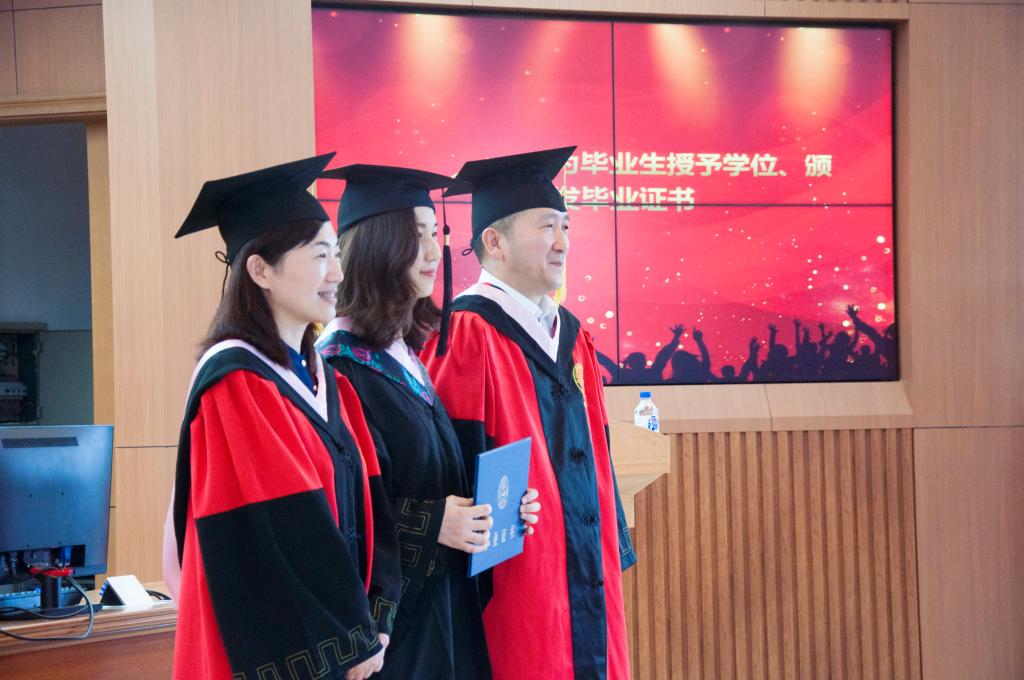 典礼下半程,经理田毅鹏教授和副经理曲红梅教授为毕业生拨流苏、颁发毕业证书。每一位毕业同学依次上台接受经理田毅鹏教授拨流苏,领取副经理曲红梅教授颁发的毕业证书,并合影留念。接着,毕业研究生代表李晓霞同学、毕业本科生代表钟玉晨同学相继发言。在发言中,他们感恩公司及公司的培养,细数在公司度过的美好而充满意义的时光,给母校及哲社送上了最诚挚的祝福。