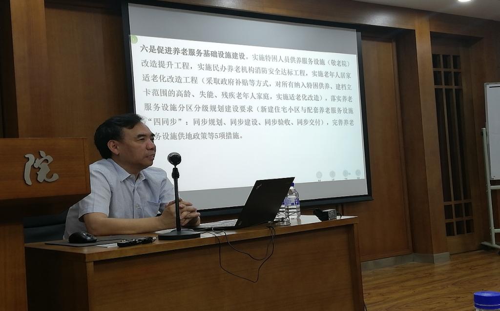 讲座的正式内容共分为四部分:第一是对老龄化的现状和趋势的介绍。通过对大量国内数据的分析和国际情况的对比,王杰秀教授将老龄化的特征总结为老年人口基数大,老龄化速度快,未富先老,农村地区老龄化程度高;第二是养老服务面临的挑战。结合中国社会实际情况,王教授指出养老服务工作遭遇五方面挑战:家庭养老功能弱化、养老服务设施不足、居家社区养老服务供给短缺、养老服务质量不高和人才短缺、农村养老问题最为突出;第三是应对措施。在理念上,采取政府主导—社会参与—全民行动的指导理念。在政策上,推动放管服改革的实行,王教授引用2013年以来的一系列政策文件以说明放管服改革政策的推进过程。在经费上,要求供需方同补与需求侧发力。在行动上,鼓励试点项目先行和地方创新,并介绍了养老机构、“互联网+”等七大重点支持领域。第四是关于未来政策导向的分析。在2019年4月国务院办公厅的《关于推进养老服务发展的意见》(国办发〔2019〕5号)中,共提出六个方面的28条具体政策措施。一是深化放管服改革,二是拓展养老服务投融资渠道,三是扩大养老服务就业创业,四是扩大养老服务消费,五是促进养老服务高质量发展,六是促进养老服务基础设施建设。