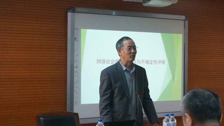 讲座过程中,刘少杰教授首先介绍了网络社会三十多年的发展历程,生动地将理论与具体实例现象相结合,表明互联网已经逐渐深入渗透到社会生活的各个领域,引起在场师生的强烈共鸣。之后,刘少杰教授重点讲解了网络社会的崛起对时空分化的巨大影响。这些影响体现在:社会空间产生了线上与线下的双重分化;缺场交往迅速发展;社会生活形成以传递经验、间接经验、规制经验为主的新基础;人们的社会认同由自我发展到群体;社会权力结构发生了深刻的变迁;网络社会还呈现出网络群体的丰富性、海量信息的不确定性等特点。此外,对于网络社会中存在的不确定性冲突,刘少杰教授认为网络社会是具有海量信息技术支撑的新社会形态,从乡土社会到工业社会再到信息社会,信息发生由匮乏到海量,由封闭稳定到不确定的变化。站在乡土社会、工业社会的立场看网络社会产生了用过去限制现在、用僵化抑制创新的人为不确定性,信息和信息技术的流动更新与社会秩序之间,追求确定性的人为不确定与网络社会的不确定之间仍存在冲突。