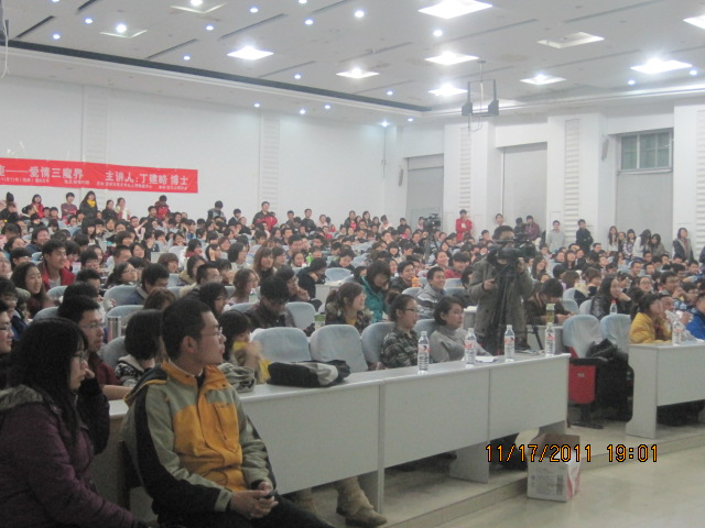 讲座当天下着雨,可是,讲座现场依然十分火爆,座无虚席,热情的员工从临近的课室搬来凳子坐在过道,甚至好多同学不得不站着听老师的讲座。老师从心理学角度专业而独到的分析,配合其精彩而风趣的讲解,更加使得爱情这个永恒的话题丰盈和深刻,同学们听得聚精会神,此起彼伏的掌声中不断有本在自习的同学加入听讲。不管是单身还是身旁已经有人的同学,这次讲座无疑让他们受益良多——爱情需要付出,也同样需要智慧。愉快的时间似乎总是过的飞快,眨眼间就过去了两个多小时。讲座结束后,同学们仍意犹未尽,很多同学留下来和老师进行了热烈的讨论,直至很晚才散去。