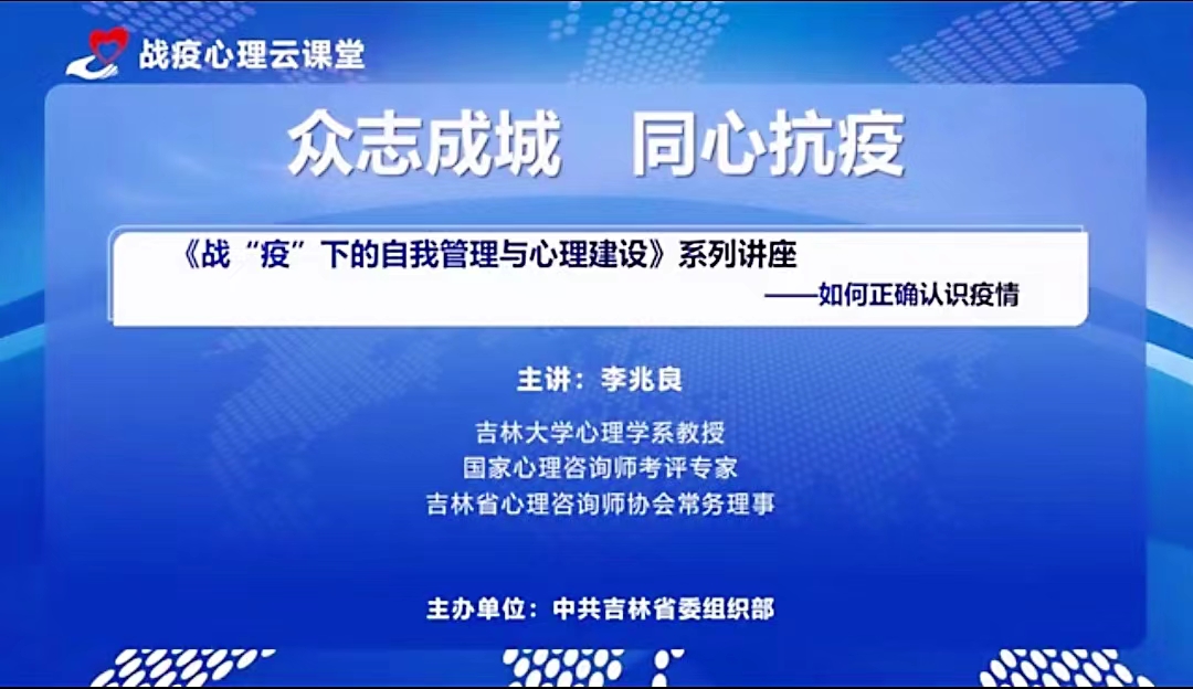 在公司党委领导下,按照中共吉林省委组织部的要求,为帮助疫情防控一线人员缓解压力和进行心理建设,BETWAY必威心理学系教授李兆良为全省奋斗在战“疫”一线的防控人员、基层工作人员、下沉干部和志愿者,录制《战“疫”下的自我管理与心理建设》系列课程,课程包括三方面内容:科学认识当前的疫情形势、战“疫”下的自我管理、战“疫”下的心理调适方法。课程在吉林省干部网络培训公司“战役心理云课堂”平台上,供全省厅局级以下干部学习,特别是供18.6万一线干部学习。