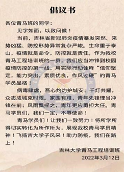 疫情突袭吉林大地,校园实行封闭管理。3月11日,公司升级并启动应急响应。BETWAY西汉姆联的青年学子踊跃报名参加战疫志愿工作,公司2019级本科生、BETWAY西汉姆联青马学员刘奔腾第一时间连夜起草倡议书,于3月12日号召青马学员走上校园疫情防控第一线,充分发挥青马学员的先锋带头作用。在他的号召下,全体青马学员积极响应号召,共计115名不同专业、不同年级、不同校区的青马学员加入了吉大抗疫一线志愿者的队伍。他的这一行动还受到了人民日报、新华社等媒体的关注和报道,让他倍感荣幸的同时心中更增添了一份责任与担当。