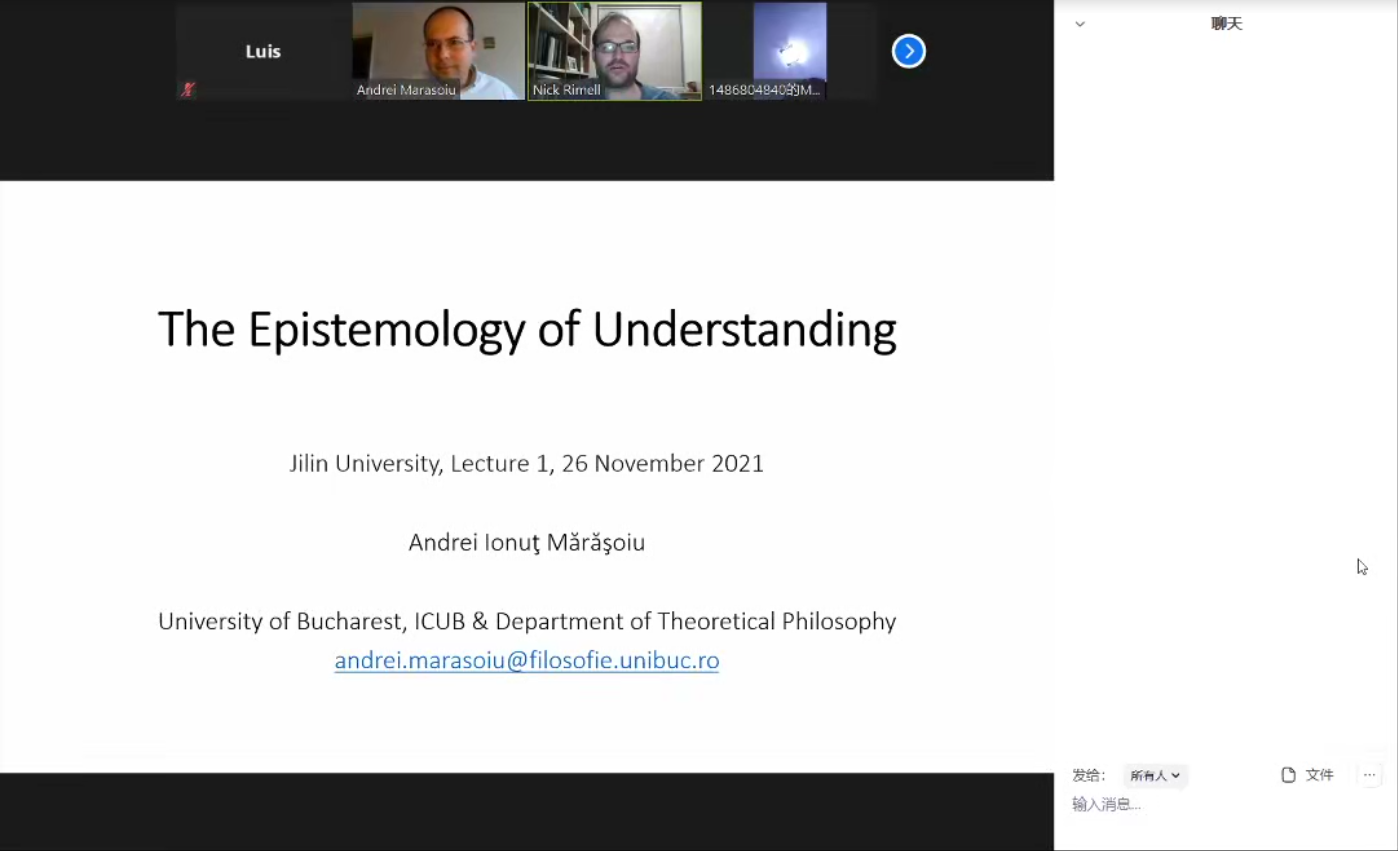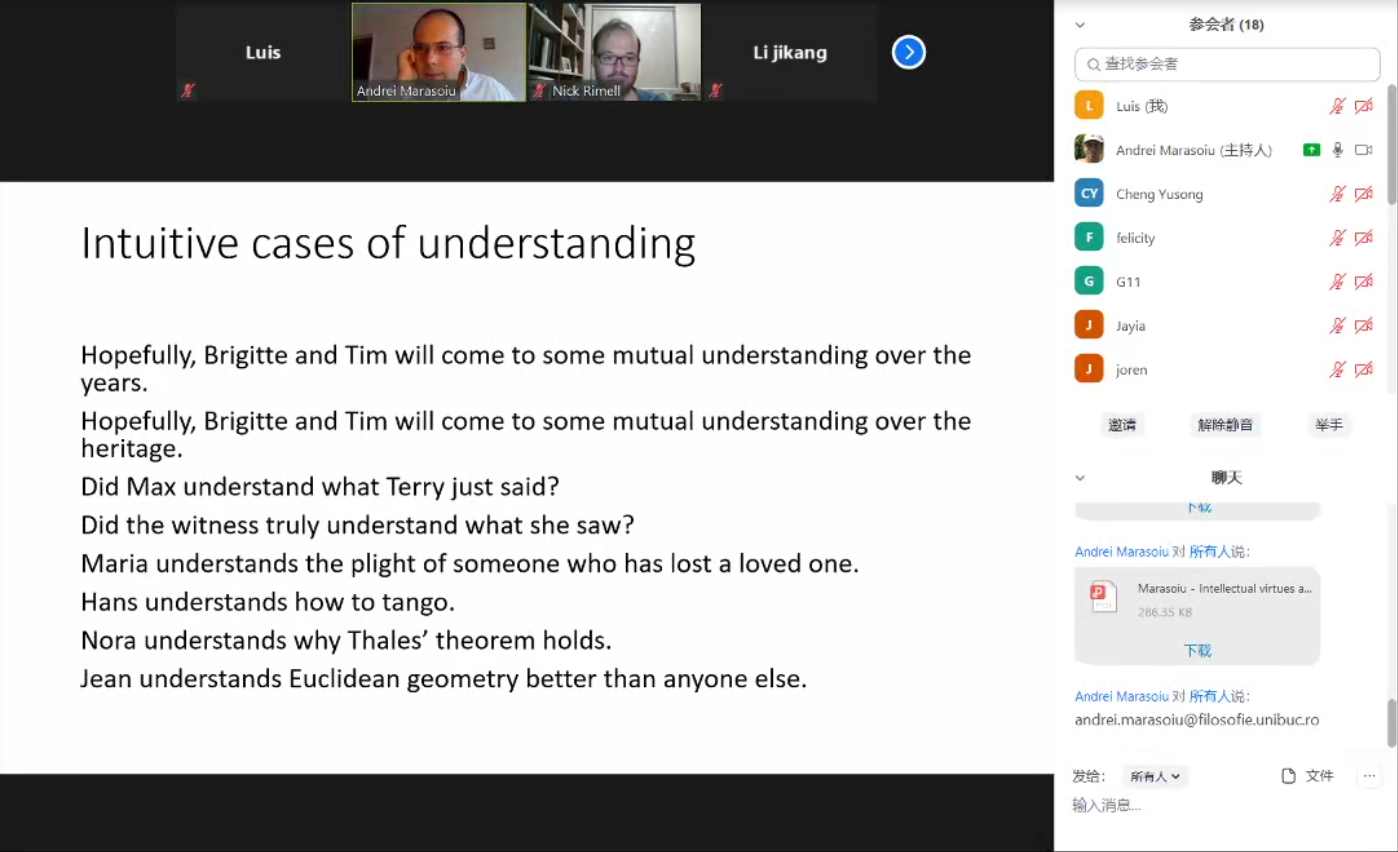 第一次课上,Andrei进行了“认识论理解的优点”的主题讲解。老师通过直观的案例对美德、理解与知识、对比与和睦进行深刻而现实的分析,并且提出了有多少美德认识论需要理解?第二次课上,Andrei进行了“借助因果关系理解”的主题讲解。讲解了科学解释的核心问题:现象之间的关系是什么?是什么让人理解了所解释的现象?并且解释了演绎法则论的解释模型,例如:零是一个数字;如果N是一个数字,N的继承者是一个数字;那么继承者相等的两个数字本身相等;第三次课上,Andrei讲述了把握现象理论的重要性、需要有意识地进行把握和理解、以及对于问题进行有意识的想法和理解后解决问题;第四次课上,Andrei主要讲述了有关论文写作的问题以及表达了对BETWAY必威的真诚感谢。至此,历时四个星期的海外优质课程《认识论的理解》圆满结束。