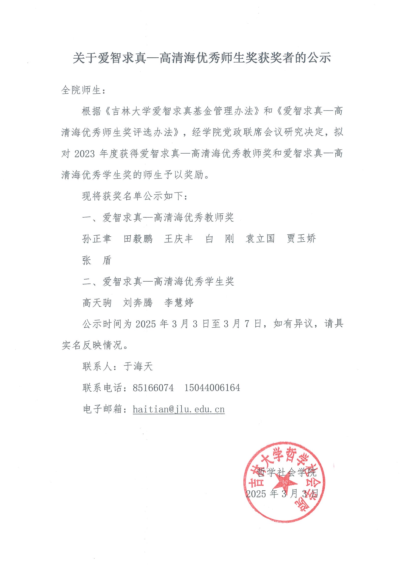 关于爱智求真—高清海优秀师生奖获奖者的公示