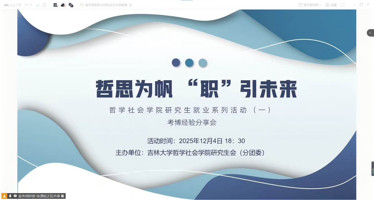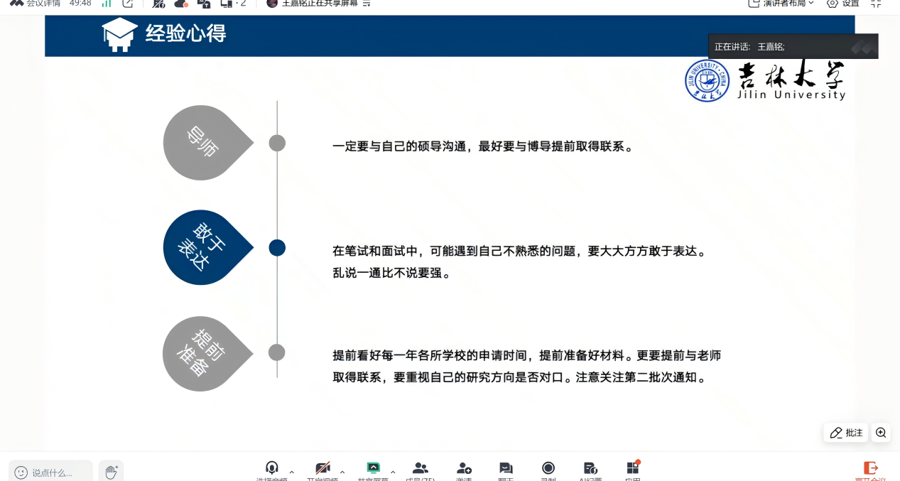 在本次分享会上,首位主讲同学对申博的全过程进行了系统复盘,着重阐述了意向导师与目标院校的筛选方法。其指出,员工在合理安排考试日程的同时,需精心准备申请材料,以充分展现个人学术成果,并且特别提醒要关注不同院校对外语能力要求的差异。第二位主讲同学围绕当前考博形势的利弊展开了深入剖析,使同学们对博士阶段的科研任务以及未来就业方向有了更为全面的认知。他强调,时间规划在申博过程中起着关键作用,鼓励大家积极尝试、广泛考察各类院校,同时留意补录及二次招生的相关信息。两位同学分别从不同视角出发,结合自身经历进行了细致分享,内容覆盖申博各关键环节,不仅助力同学们系统了解申博流程,也进一步明确了其中需重点关注的事项。活动末尾,主持人对本次分享进行了总结,诚挚感谢两位毕业生在科研任务繁重之时仍心系母校、倾心分享,并勉励在校同学尽早确立目标、勤奋耕耘、善用资源,将当日所学转化为未来学术道路上的坚实成果。