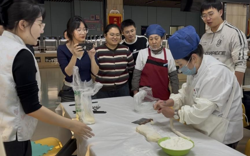 包饺子过程中,同学们自发分工协作,形成高效有序的流水作业:部分成员负责揉面擀皮,部分专注包馅塑形。大家互相学习、协同配合,所包饺子形态各异、颇具创意。经验丰富的教师与餐厅工作人员不时予以指导,耐心纠正操作细节,现场欢声笑语不绝,湖畔餐厅内洋溢着温馨而热烈的气氛。