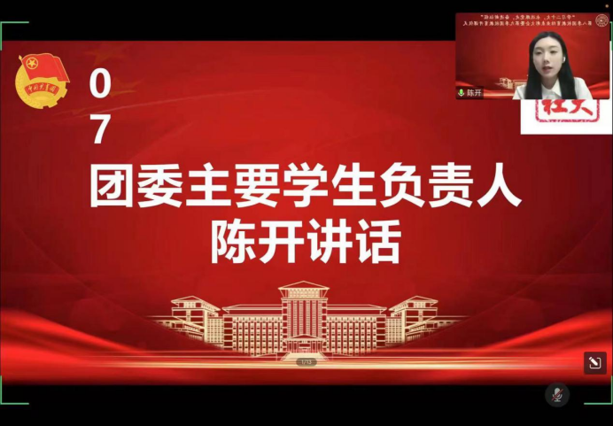 大会第七项,由团委主要员工负责人陈开发表讲话。陈开同学首先代表BETWAY必威团委对本季团校的顺利举办表示祝贺,并对BETWAY必威团校的过往发展、开设内容以及思想引领作用做了详细介绍。同时,她对同学们提出了三点要求:一是要紧跟新时代发展主潮流,用思想引领把握方向;二是要尽显青年一代责任担当,用实践引领增强本领;三是要着力深化理论学习教育,用知识引领武装头脑。