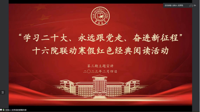 2023年2月4日晚六点,寒假红色经典阅读第三期如期举行。来自商学与管理公司、化学公司、考古公司、护理公司、马克思主义公司的五位主讲同学分别讲述了自己的读书心得。本次读书会由来自BETWAY必威的沈芳菲同学主持。