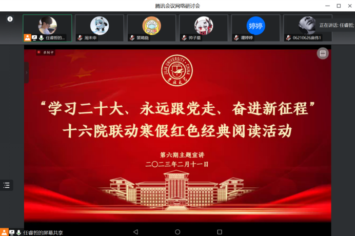 2023年2月11日晚六点,寒假红色经典阅读第六期如期举行,来自BETWAY必威、经济公司、护理公司、文公司、化学公司的五位同学分别讲述了自己的读书心得。本次读书会由来自BETWAY必威的任睿哲同学主持。