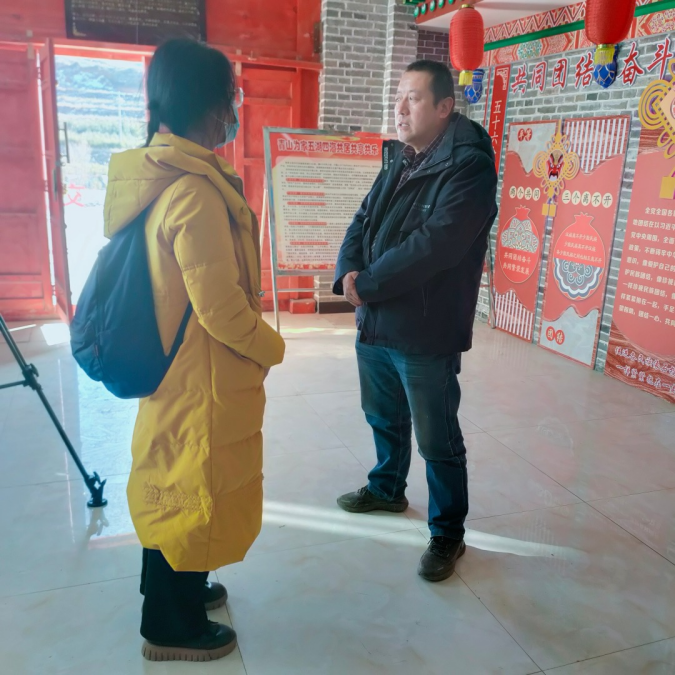 第二天,调研团队邀请到社火省级非遗传承人兼陈靳乡村主任赵小龙进行访谈,他向调研团队详细介绍了当地高台马社火的起源及其发展历程,并对现今社火文化带动当地文化产业发展进行解释呈现。