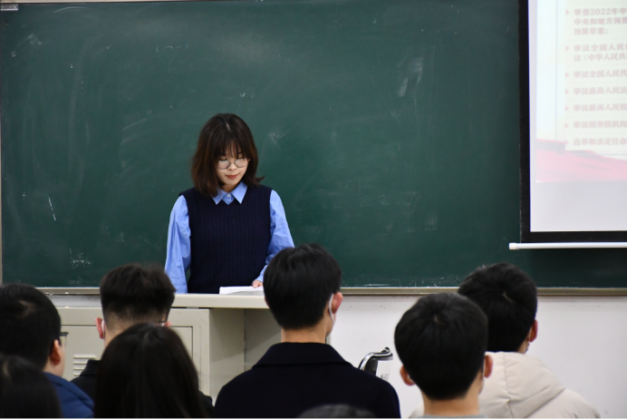 沈芳菲同学带领大家学习两会的主要内容。她将两会的主要议题进行对比讲解,分析了这些议题与民生、时代发展之间紧密的关联;而后为大家讲解了“中国式现代化”、“全面建设社会主义现代化国家”、“全过程人民民主”、“协商议政”等数十个两会热词的含义;最后以习近平总书记在两会上的发言作为结尾,号召大家不断为强国建设、民族复兴伟业添砖加瓦、增光添彩。