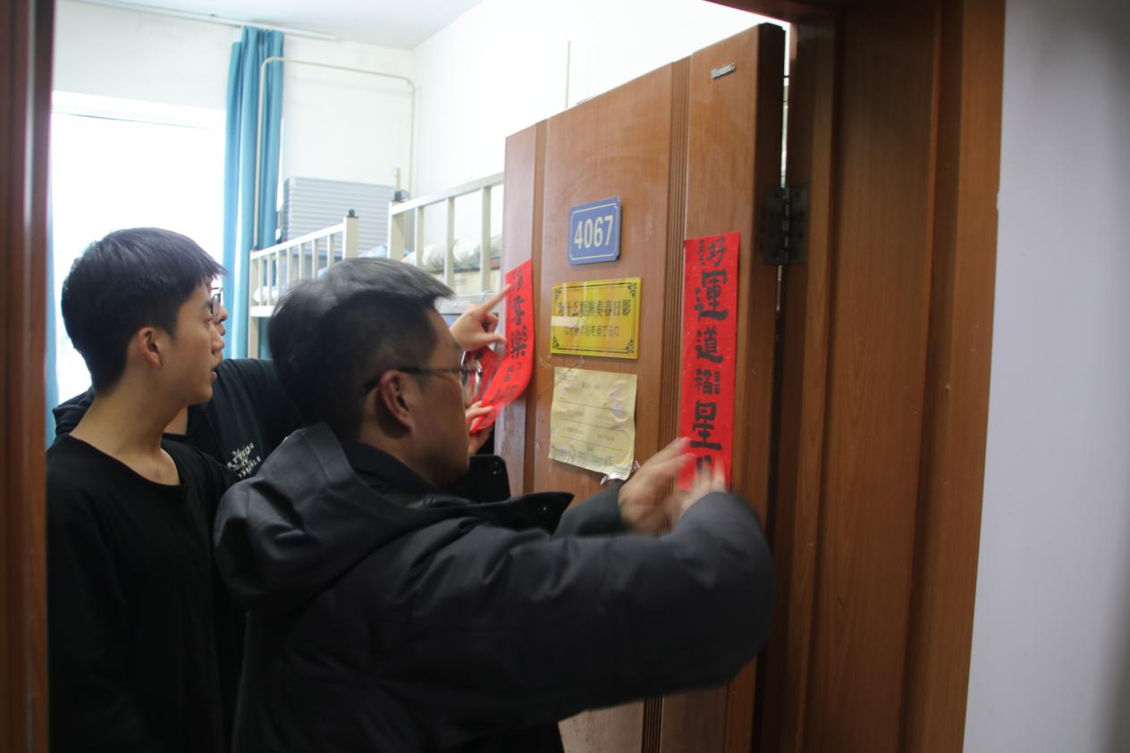 元旦假期将至,为培养员工良好的劳动实践能力和安全意识,提高员工自我管理和自我服务能力,共同营造整洁优美的公寓环境,同时深入了解本科员工期末考试复习情况,深入开展诚信教育和备考提示,12月29日,公司党委副书记兼副经理刘培强老师带队,员工工作办公室主任刘畅老师、辅导员宋绍伟老师以及公司各本科生年级主要负责同学组成工作小组,开展本科生员工寝室走访贴春联暨节前安全与诚信考试提示工作。