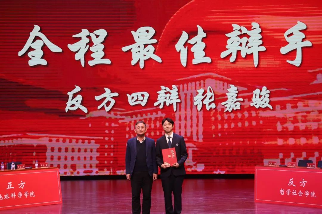 沈芳菲同学临危不乱,在开篇立论中先发制人,风趣幽默,通过对比观点为己方开宗明义;仵博宇同学逻辑清晰,思维敏捷,精辟的措辞和犀利的言语燃爆全场;范祺轩同学机智干练,面对反方的提问面不改色沉着应对;张嘉骏同学对答如流,稳健细致,从小事出发援疑质理,从容有度。