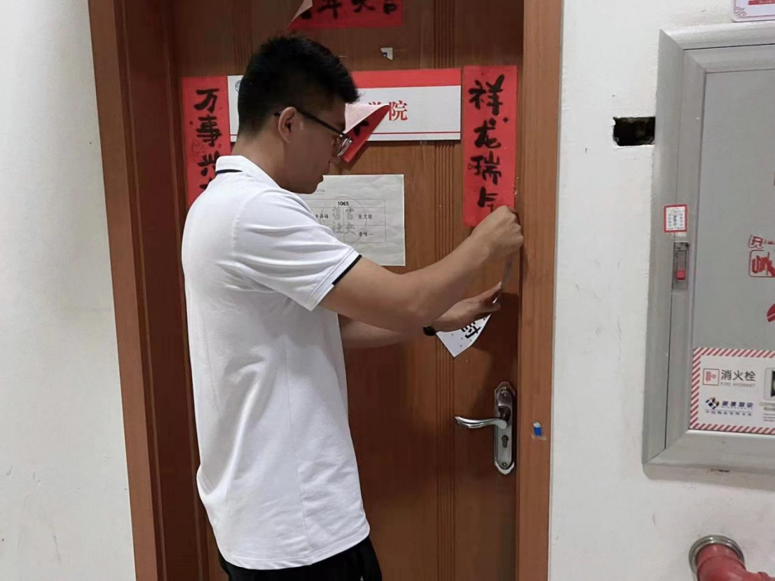 抵达员工公寓后,刘畅老师首先针对离校员工的寝室,进行了全面细致的消防安全隐患检查,并对检查中发现的潜在安全问题进行及时整改。随后,刘畅老师和张鑫鹏老师为离校员工的寝室粘贴了封条,进一步为离校员工营造安全可靠的寝室环境。