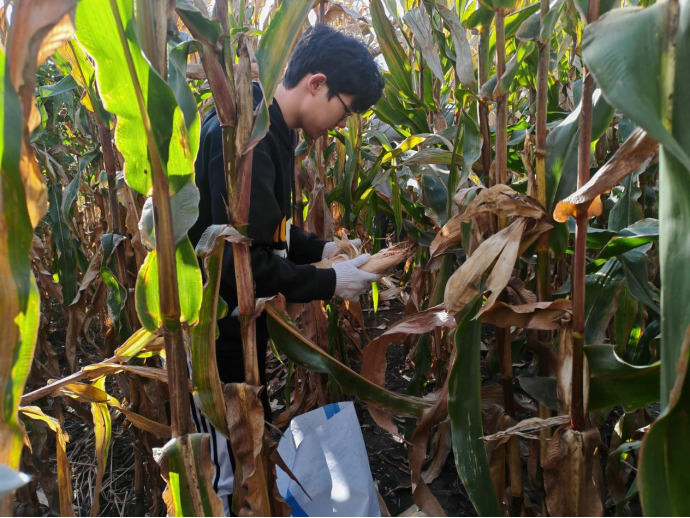 到达实践基地后,农业基地的相关负责教师引导同学们前往了自主研发品种试验田,并详细介绍了玉米、地瓜、花生等作物的生长过程,培育要点以及采摘方法。同学们认真聆听讲解,在做好劳动保护措施后分工明确,有条不紊地投入到了收获实践中。