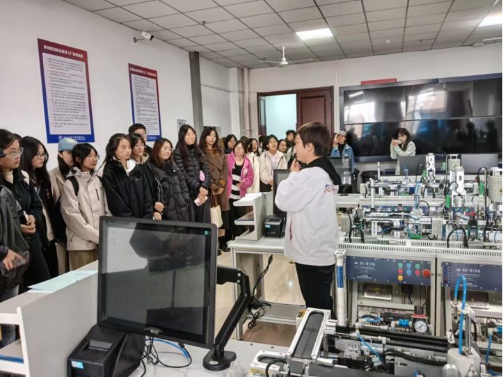 在训练中心老师带领下,同学们有序进入专业作业间,参观多线联动模拟药厂、3D打印、激光加工、数控车加工等机械的工作流程,聆听老师对不同仪器发展历程和运用前景的阐述,并尝试操作机器人,感受科技之于每个人的应用价值。