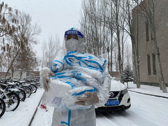 南区“快递员”团委书记于士博老师。在公司封校后,于老师第一时间打包行李入住公司,立刻投入校内防疫工作,负责整个南区的物资配送工作。于老师每天都要工作十几个小时,保障各类防疫物资及时送达。他穿着厚重的防护服,抱着防疫物资在冰天雪地里艰难行走,始终奔波在为员工服务的第一线,积极地为同学们解决实际困难。于老师在为同学们服务的同时,也不忘关心大家的学习和日常生活,从防疫到生活,他事无巨细。于老师用自己的认真负责和无私奉献温暖了所有员工,也践行着青年人的责任与担当,为同学们树立了榜样!我们都始终相信,“吉林必有吉临时,长春必复往常春”!