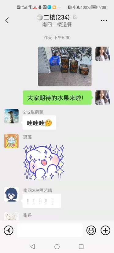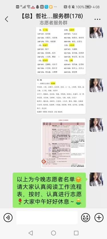 封寝当天,在公司书记和老师们的领导下,南四哲社女生组建了100多人在内的志愿者服务群,我也开始全面负责志愿者们的所有工作,扛起了这面大旗。作为哲社女生负责人,我加入了南四负责人总群,开始全面对接南四的老师,并频繁和其他公司同学沟通联络。我悄悄地立下了一个flag:一定不能辜负老师和志愿者同学们对我的期望,一定要尽力照顾到每位师姐师妹和同学们的需求,帮助南四姐妹们度过一个美好的封寝生活。