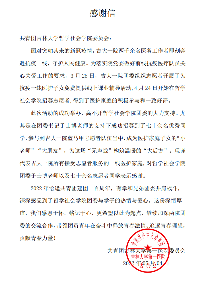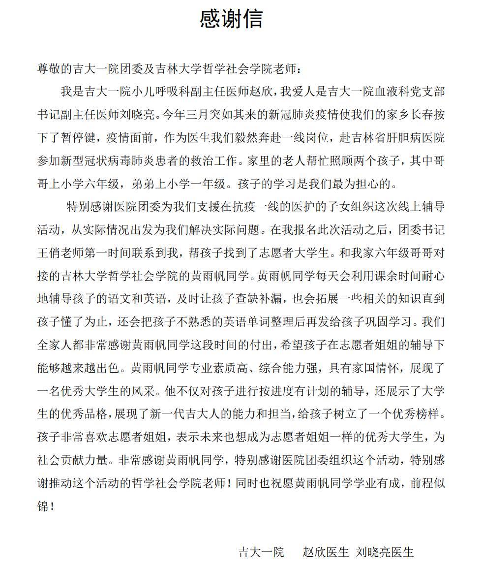 近日,公司团委与2021级本科生黄雨帆同学分别收到了来自BETWAY西汉姆联第一医院(以下简称“吉大一院”)团委和吉大一院赵医生、刘医生的感谢信。自疫情发生以来,吉大一院团委针对投身防疫一线的医务工作者子女开展线上课业辅导活动,公司团委积极配合兄弟公司工作,广大哲社学子积极响应号召,热心报名,对医务工作者子女开展线上陪伴服务,在公司、同学们和医护家庭中产生良好反响。