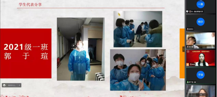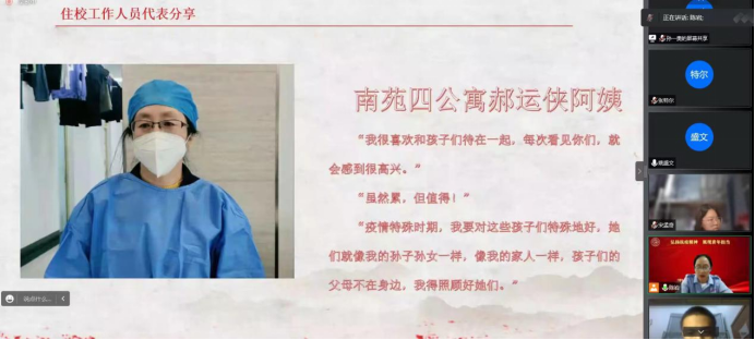 随后,南苑四公寓工作人员郝运侠阿姨向同学们分享了她的心声。郝阿姨讲述了自己在疫情封闭管理期间的工作:在疫情爆发初期,不顾个人安危入驻公司,与员工同吃同住、共同战斗;抗疫期间,每天工作10多个小时,进行消杀、分发三餐和防疫物资;当同学们身体和心理出现问题时,第一时间前往照顾,给予关怀。郝阿姨说,“我很喜欢和孩子们待在一起,疫情特殊时期,我要对这些孩子们特殊地好,她们就像我的孙子孙女一样,像我的家人一样,我得照顾好她们”。正是这种强烈的责任感与大爱,支撑郝阿姨完成抗疫任务,为我们树立了榜样。