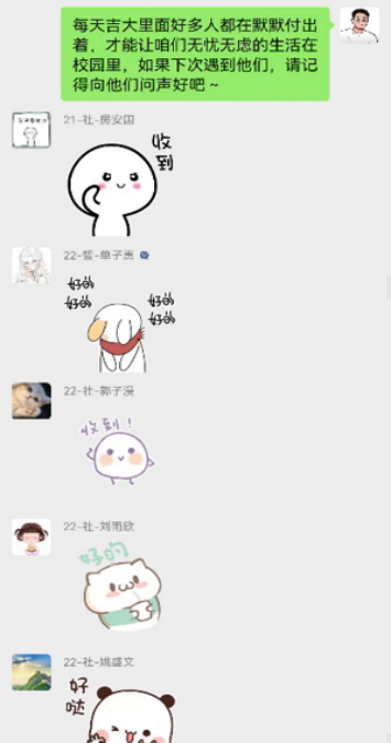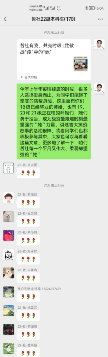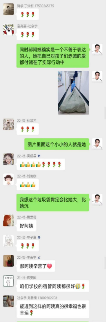 会议结束后,辅导员宋绍伟老师和同学们在年级群中进行了简单的心得交流。宋老师通过介绍战疫中的勇于担当、顽强拼搏的哲社“她”力量,鼓励同学们要向优秀的师姐们学习;通过对郝阿姨的事迹介绍,提醒同学们要尊重每一位默默无闻却为了我们能够在校园中无忧无虑生活的“陌生人”。同学们纷纷表示会牢记本次活动的教育,常怀感恩之心,积极回报善意。活动在师生热烈的交流中顺利结束。