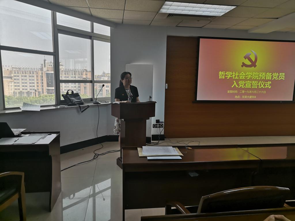 仪式在雄壮的《国际歌》中开始,张俊峰同志宣读参加入党宣誓的预备党员名单。在宣誓环节,由哲学系硕士崔光磊同志领誓,全体预备党员面向党旗进行了庄重的宣誓仪式。在场同志庄严肃穆,郑重许下为共产主义事业奋斗的承诺。