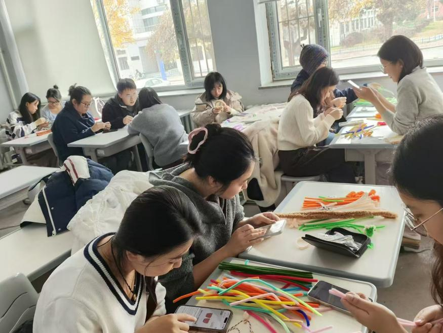 活动伊始,主持人向同学们介绍了扭扭棒手工制作的心理疗愈原理,通过手部操作的重复性动作,参与者能够逐渐进入冥想状态,从而释放内在的焦虑与紧张。随后,同学们自行分组并挑选心仪的手工材料,与同伴一起沉浸在创作的乐趣中,通过细腻的编织手法展现内心的宁静,现场氛围轻松愉快。