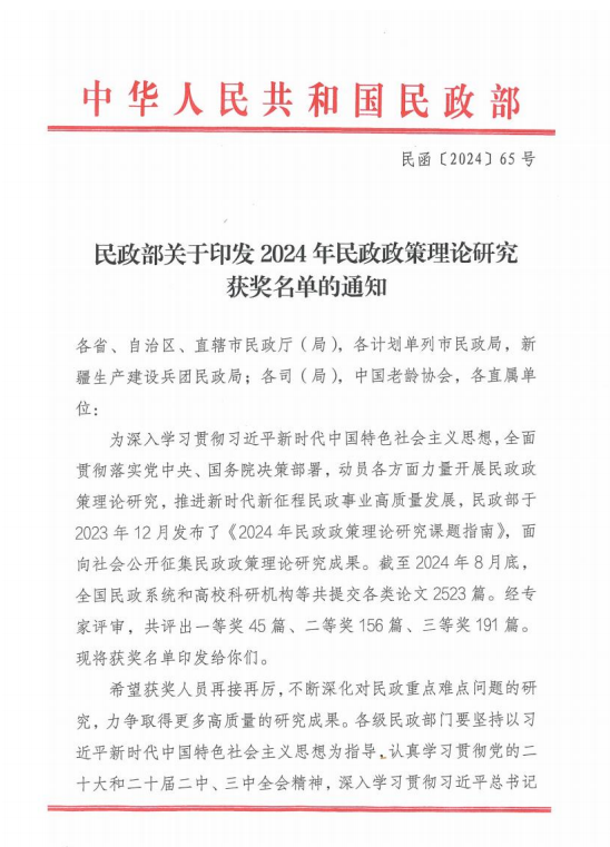 为深入学习贯彻习近平新时代中国特色社会主义思想,全面贯彻落实党中央、国务院决策部署,动员各方面力量开展民政政策理论研究,推进新时代新征程民政事业高质量发展,民政部于2023年12月发布了《2024年民政政策理论研究课题指南》,面向社会公开征集民政政策理论研究成果。本院员工积极参与此次活动。2024年11月1日,中华人民共和国民政部发布了关于印发2024年民政政策力量研究获奖名单的通知,BETWAY必威2017级社会学专业博士研究生徐莉、成彦提交的文章《中国式现代化背景下现代公墓业发展路径研究》荣获三等奖。