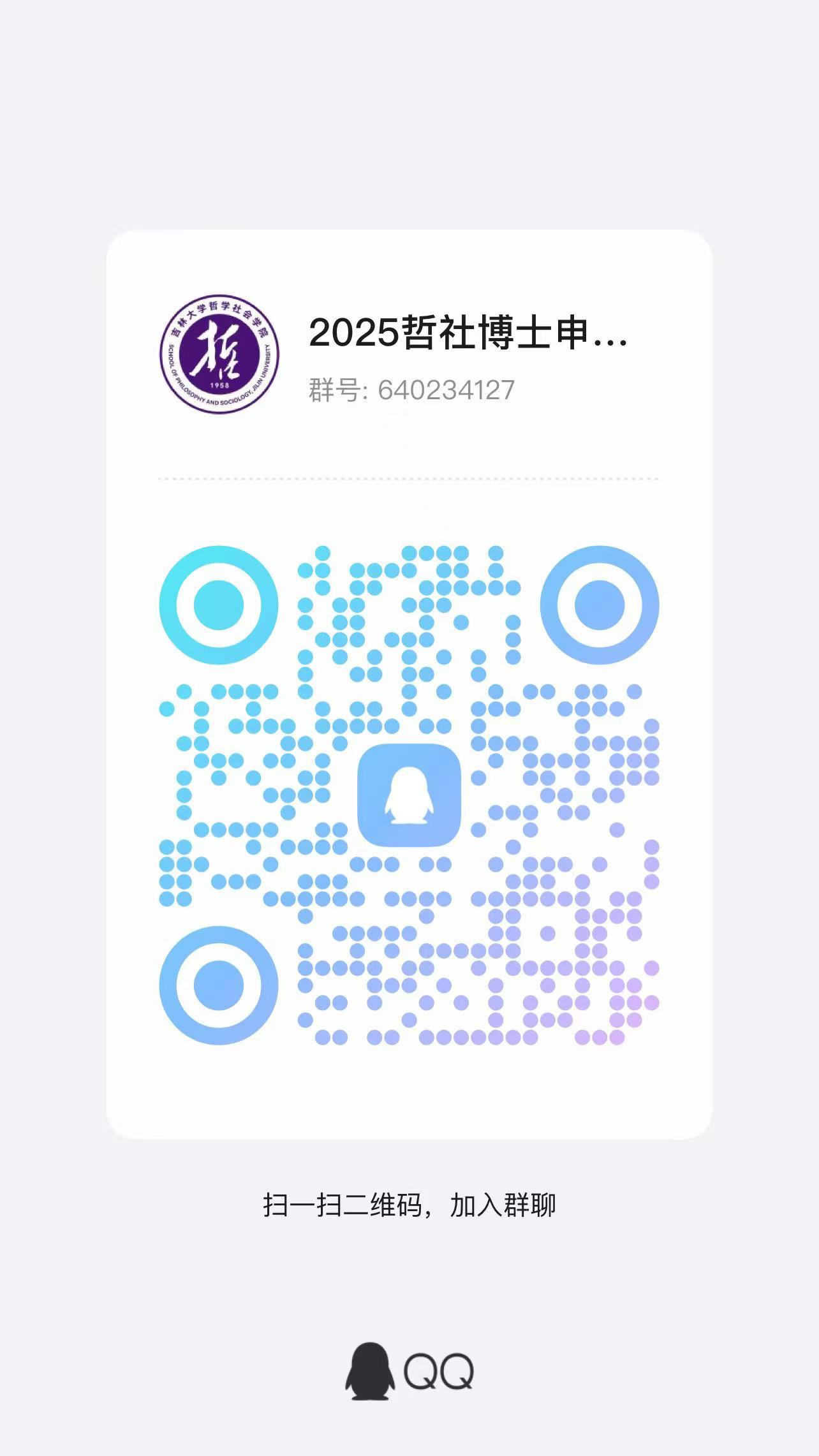 复试 QQ 群号:640234127,(进群时请报名姓名+专业,请进群后实名备注)“2025哲社博士申请考核复试群”,后续具体考试信息都将在此群内通知,不在公司主页发布,望周知。