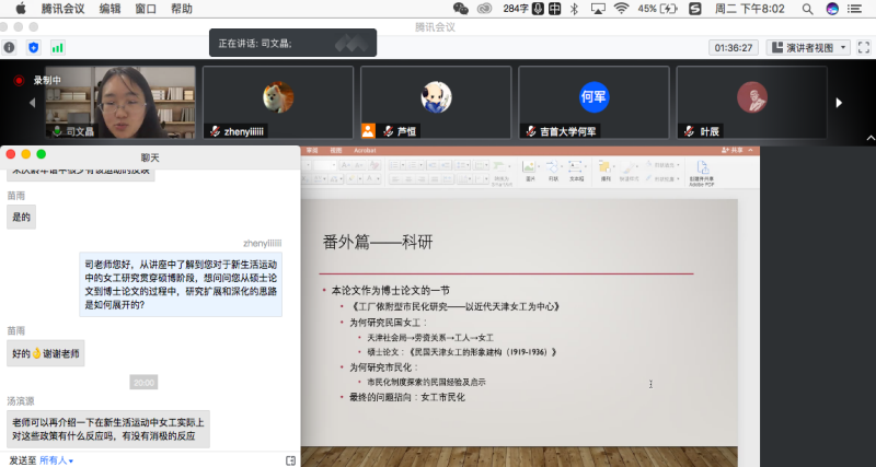 讲座尾声,与会师生和司文晶老师就新生活运动中女性工人对政策的反馈、宋庆龄对新生活运动的态度及硕博论文写作中研究逻辑的深化等问题进行交流。最后,芦恒教授对本场讲座进行评议与总结。他指出,合格的社会学研究者,往往需要借助理论视角和框架,对浩如烟海的资料进行整合、提炼和升华,正如本次讲座中,内容虽集中于“新文化运动”这一案例,但从中体现出司文晶博士在研究过程中扎实的理论功底和丰富的历史材料积累,给听众以社会学学习与研究上的深刻启迪。